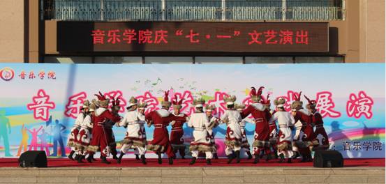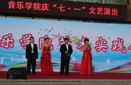 为庆祝中国共产党成立94周年,7月3日,音乐学院在学校明德楼前举办了庆祝中国共产党成立94周年文艺晚会暨音乐学院艺术实践展演,音乐学院领导以及部分师生观看了演出。