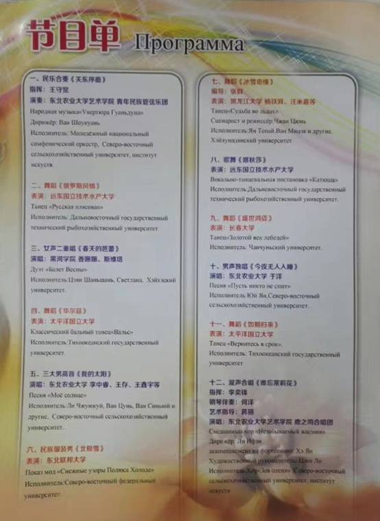 据悉,本次论坛,是在国家“一带一路”宏观战略提出的大背景下,为了促进中俄两国文化交流,加强中俄两国高校深层次交流合作,东北农业大学作为中国东北地区与俄罗斯远东及西伯利亚地区大学联盟发起人和中方秘书处单位,联合太平洋国立大学、黑龙江大学、远东国立技术水产大学、长春大学、东北联邦大学、黑河学院共同呈现的一台具有中俄两国文化特色的、高水平、高规格、高层次的文艺汇演。