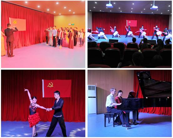在全体党员庄严地重温入党誓词后,演出正式拉开帷幕。拉丁舞《青青校园》表现了当代大学生的青春活力以及大学生们对成为一名优秀共产党员的向往;竹笛独奏《红星照我去战斗》、萨克斯演奏《党啊,亲爱的妈妈》不仅勾起了对中国革命峥嵘岁月的回忆,也奏出了全院师生对中国共产党的赞美;歌曲《红梅赞》唱腔深沉流畅而又醇厚隽永,展现了英姿飒爽、坚守信仰的革命者形象;中俄教师配合默契的四手联弹《世界的盛宴》将现场气氛推向高潮;演出在歌曲《走进新时代》中落下帷幕。