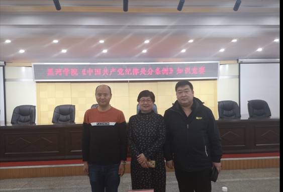 更好地学习宣传贯彻《中国共产党纪律处分条例》,以赛促学、以知促行,校纪委于11月14日下午在明德楼五楼多功能厅举办《中国共产党纪律处分条例》知识竞赛,36个部门76名党员干部参加比赛。音乐学院党总支书记吴赛娟、学生党支部书记丛永柱、青年教师党员富鹏飞参加了本次知识竞赛。