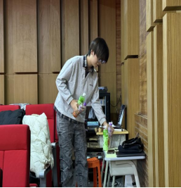 活动现场,学生干部们热情高涨、干劲十足。大家自带清扫工具,按照既定分工有序行动:有的负责清扫地面灰尘、捡拾杂物,不放过任何一个卫生死角;有的专注于擦拭钢琴、音响等演出设备,细致清理设备表面的灰尘与污渍,确保设备正常运行;还有的负责整理音乐厅内的座椅、乐谱架,将各类物品摆放整齐。过程中,大家相互配合、互帮互助,充分展现了学生干部的责任与担当。经过数小时的辛勤劳动,黑匣子音乐厅的环境焕然一新,地面干净整洁,设备光亮如新,物品摆放井然有序,为同学们提供了优质的艺术实践空间。